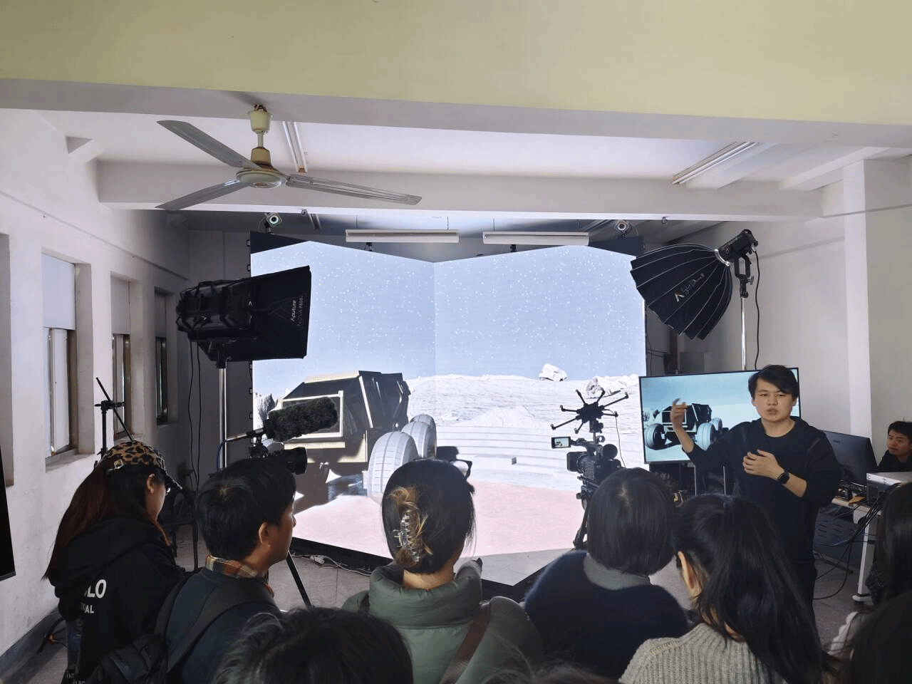 此次实战营分为离线动画、实时数字人、XR虚拟拍摄三个学习方向。实战营前期,XR虚拟拍摄方向的学员学习了虚拟拍摄环境搭建与hecoos技术讲解、光学追踪理论讲解与实操、LED屏幕理论讲解与实操、灯光理论讲解与实操的课程。离线动画和实时数字人方向的学员学习了动作捕捉、UE软件使用等理论与实践课程。实战营后期主要侧重于实践操作。伟德bv1946官网老师和同学们进行了充分的小组讨论,不断打磨创意并进行大量实践尝试。借助实战营提供的先进的动捕设备,同学们将每一个动作和表情都捕捉得栩栩如生。经过反复推敲、调整和优化,大家共同制作出了十二秒的动画短片。