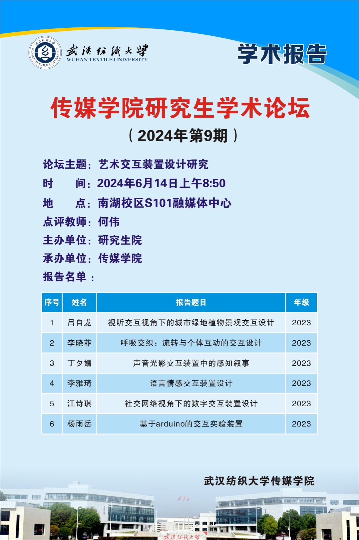 2024年6月14日上午,伟德国际1946bv官网在南湖校区西经楼 S101室举办第9期研究生学术论坛。本次论坛的主题为“艺术交互装置设计研究”, 旨在锻炼研究生的实操能力,提倡理论与实践相结合,为研究生们提供展示才华、分享经验的交流平台,激发更多创意和灵感交流。