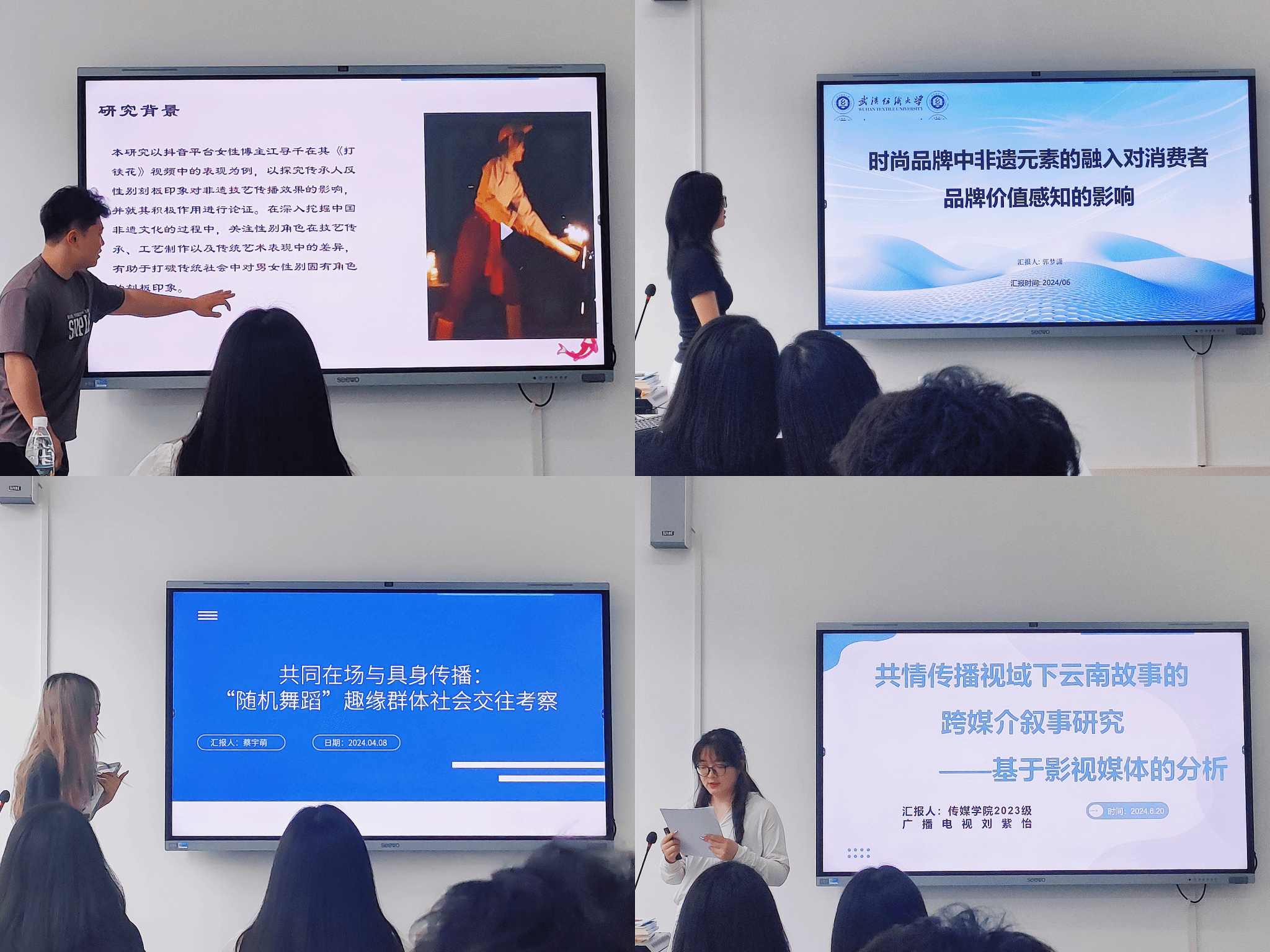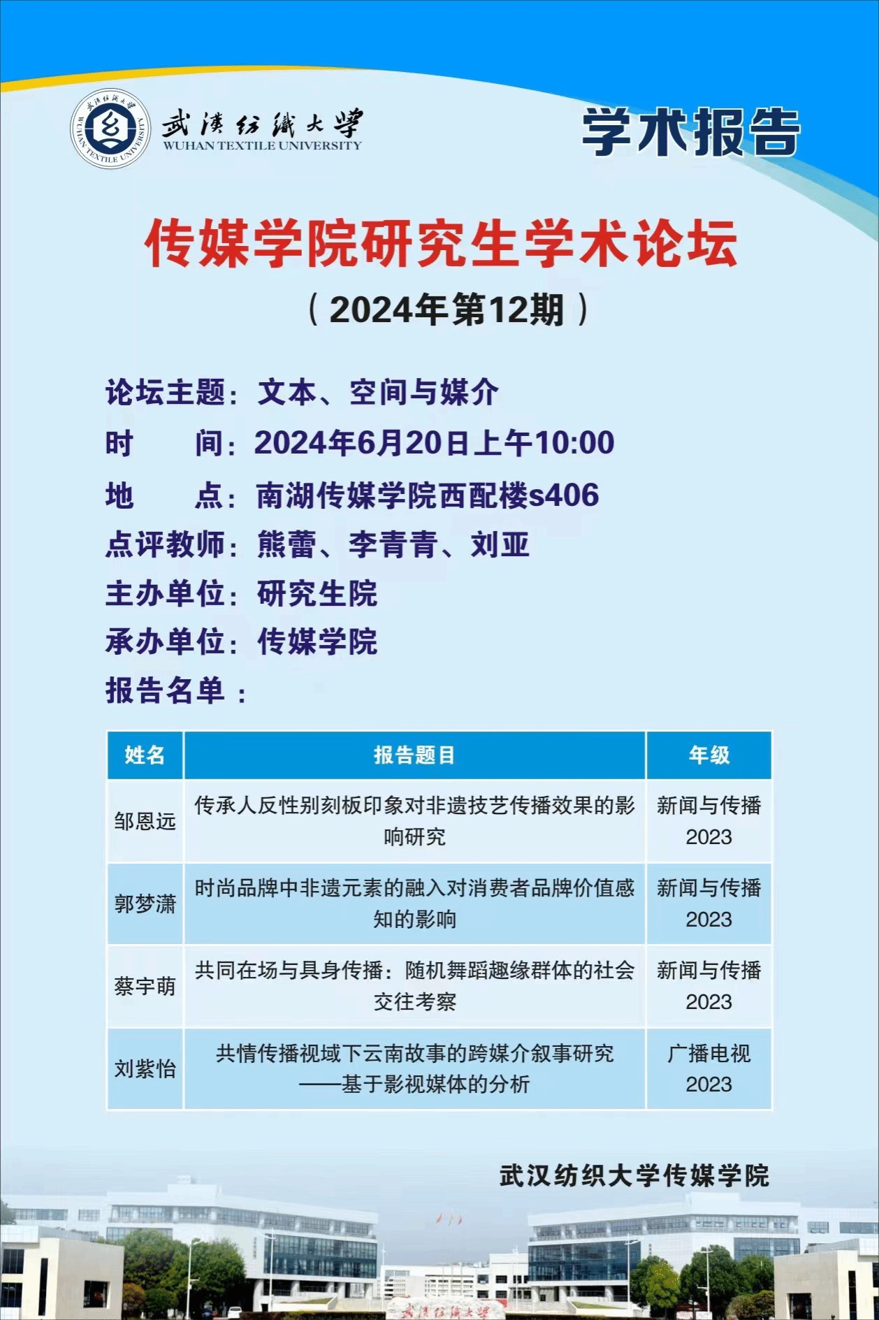 为促进师生间的深入对话与学术交流,激发学术思考与创新活力,伟德国际1946bv官网于2024年6月20日上午举办本年度第12期研究生学术论坛。本次论坛围绕“文本、空间与媒介”这一核心议题,邀请了熊蕾副教授、李青青副教授、郑湛副教授和刘亚博士四位硕士研究生导师共同探讨。来自新闻与传播、广播电视专业的四位2023级研究生分享自己的研究成果,新闻与传播专业2023级研究生参加。