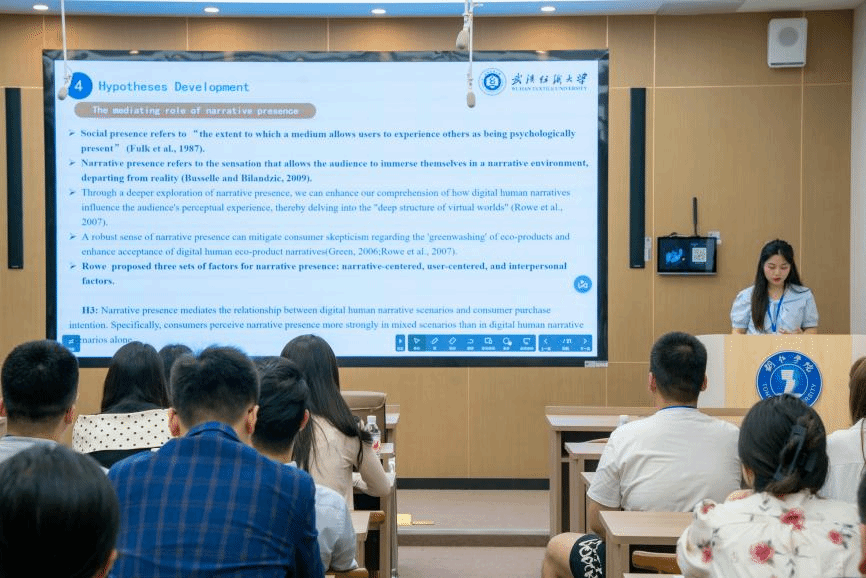 随后,2023级研究生王思捷分享了题为《情景敏感度对消费者选择人工智能推荐的影响研究》的论文,展示了其研究成果和发现。与会点评专家对其研究问题的创新性表示了肯定,并就论文修改提出了详尽的指导性意见。