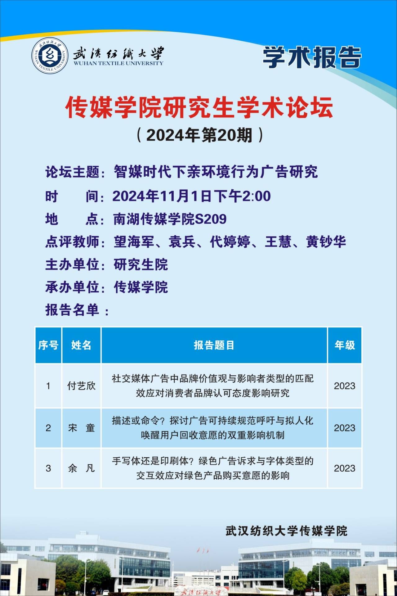 为提升研究生学术论文阅读写作能力,激发团队学术思考与创新活力,加强师生交流对话,11月1日,伟德国际1946bv官网时尚传媒量化研究中心举办2024年第20期伟德国际1946bv官网研究生学术论坛“智媒时代下亲环境行为广告研究”。望海军、袁兵、代婷婷、王慧、黄钞华等研究生导师参会并点评,团队全体研究生参加本次活动。