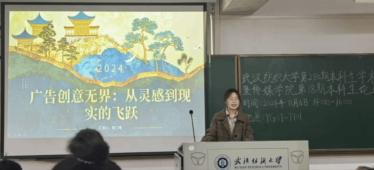 广告12202班的张汀琦同学在《广告创意无界:从灵感到现实的飞跃》中以“创意的源泉:灵感从哪来”提问,引发在场同学思考,并分享了获奖作品《宫苑秘影》的灵感来源,探索创意表达方法的多样化,为社交媒体与创意思维的融合注入了新活力。