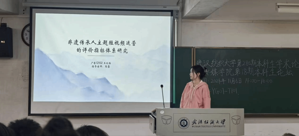 广告12102班的王欣怡同学在《非遗传承人主题短视频运营的评价指标体系构建》中分享了“非遗传承人”“短视频运营评价体系”“抖音平台非遗传承人主题短视频现状”三个关键词,介绍其研究计划和优化方案,她提出构建一个科学、合理的评价指标体系,从而促进非遗传承人主题短视频内容的优化和提升。