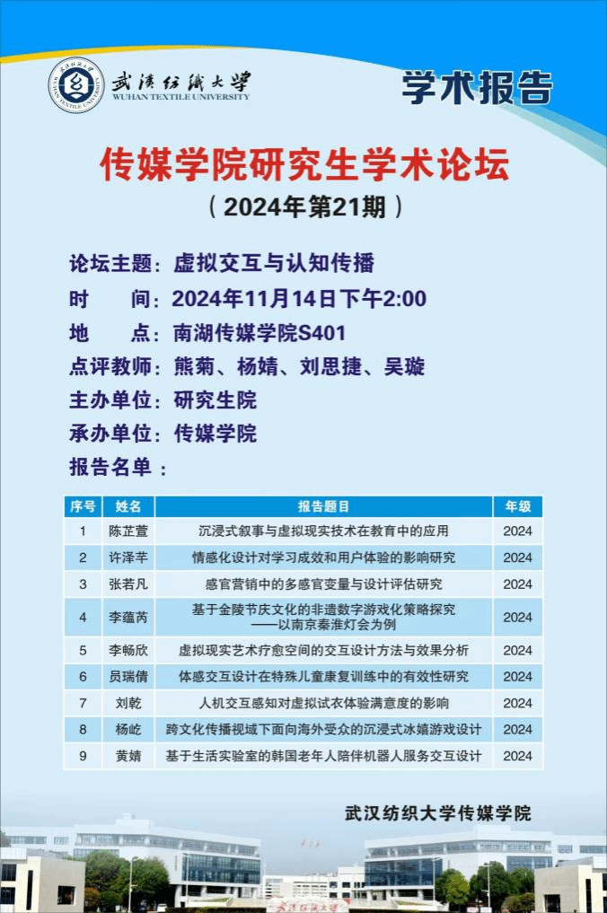 为进一步提升研究生学术素养,促进学术创新与交流,伟德国际1946bv官网于2024年11月14日下午2:00在南湖伟德国际1946bv官网S401室成功举办了以“虚拟交互与认知传播”为主题的第21期研究生学术论坛。本次论坛由研究生院主办,伟德国际1946bv官网承办,伟德国际1946bv官网硕士研究生导师熊菊、杨婧、刘思捷、吴璇受邀作为点评教师,她们对参与论坛的研究生们的学术报告进行了深入的点评和指导。