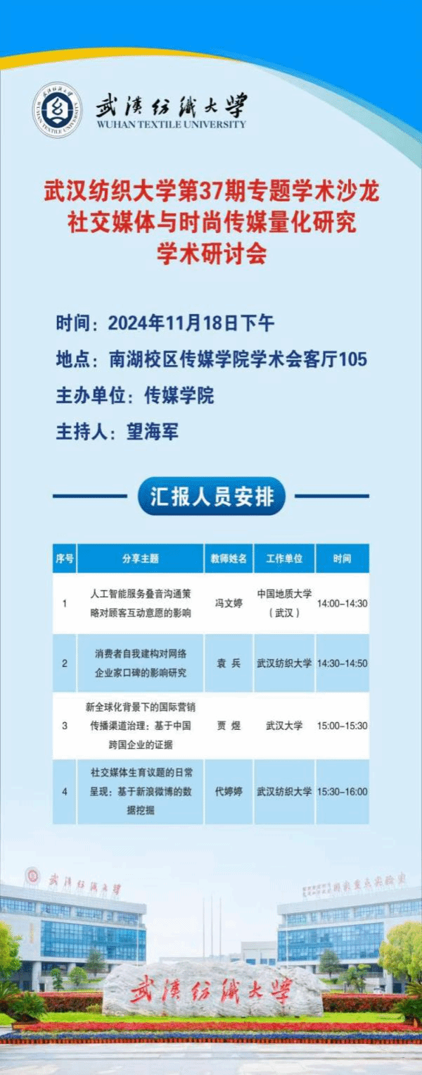 11月18日下午,bevictor伟德官网入口第37期专题学术沙龙在南湖校区伟德国际1946bv官网学术会客厅105举办。本次学术研讨以“社交媒体与时尚传媒量化研究”为主题,武汉大学贾煜副教授、中国地质大学(武汉)冯文婷副教授、伟德国际1946bv官网时尚传媒量化研究中心的全体老师和研究生参加会议。研讨会由伟德国际1946bv官网院长望海军教授主持。