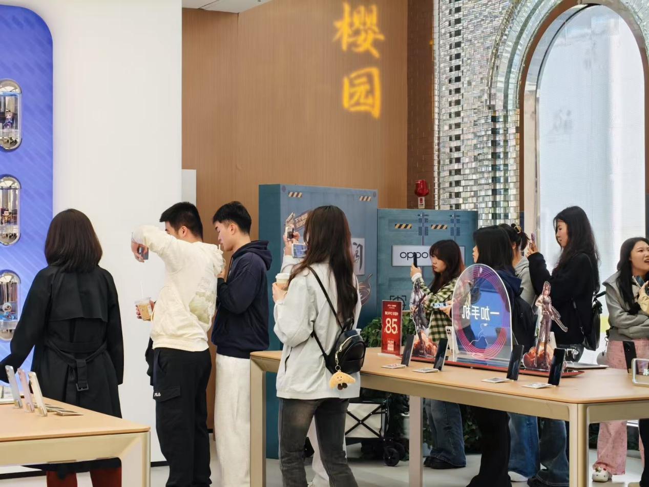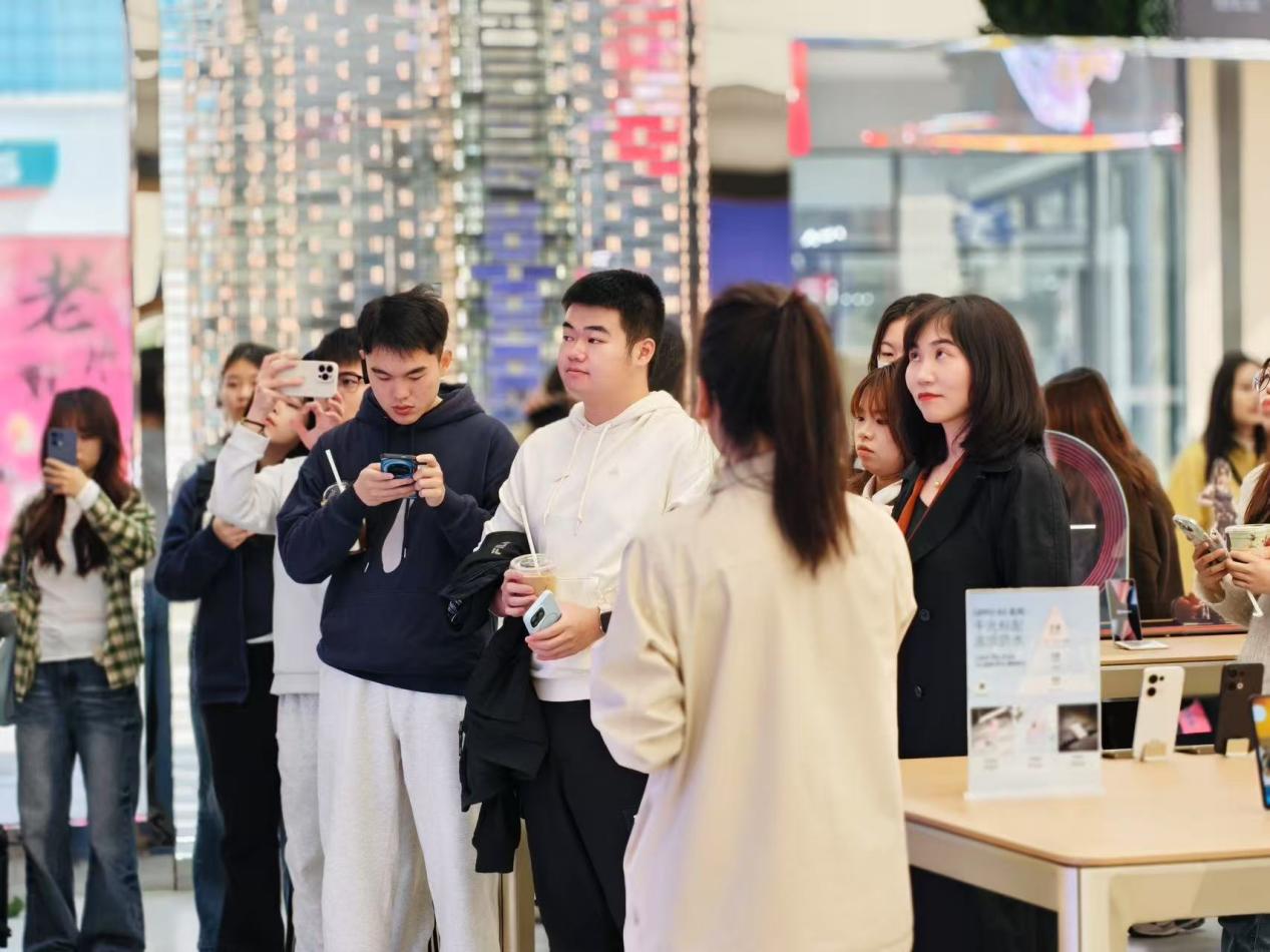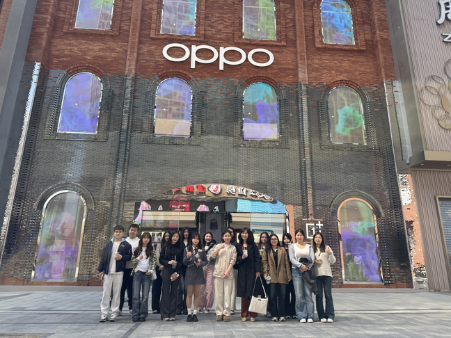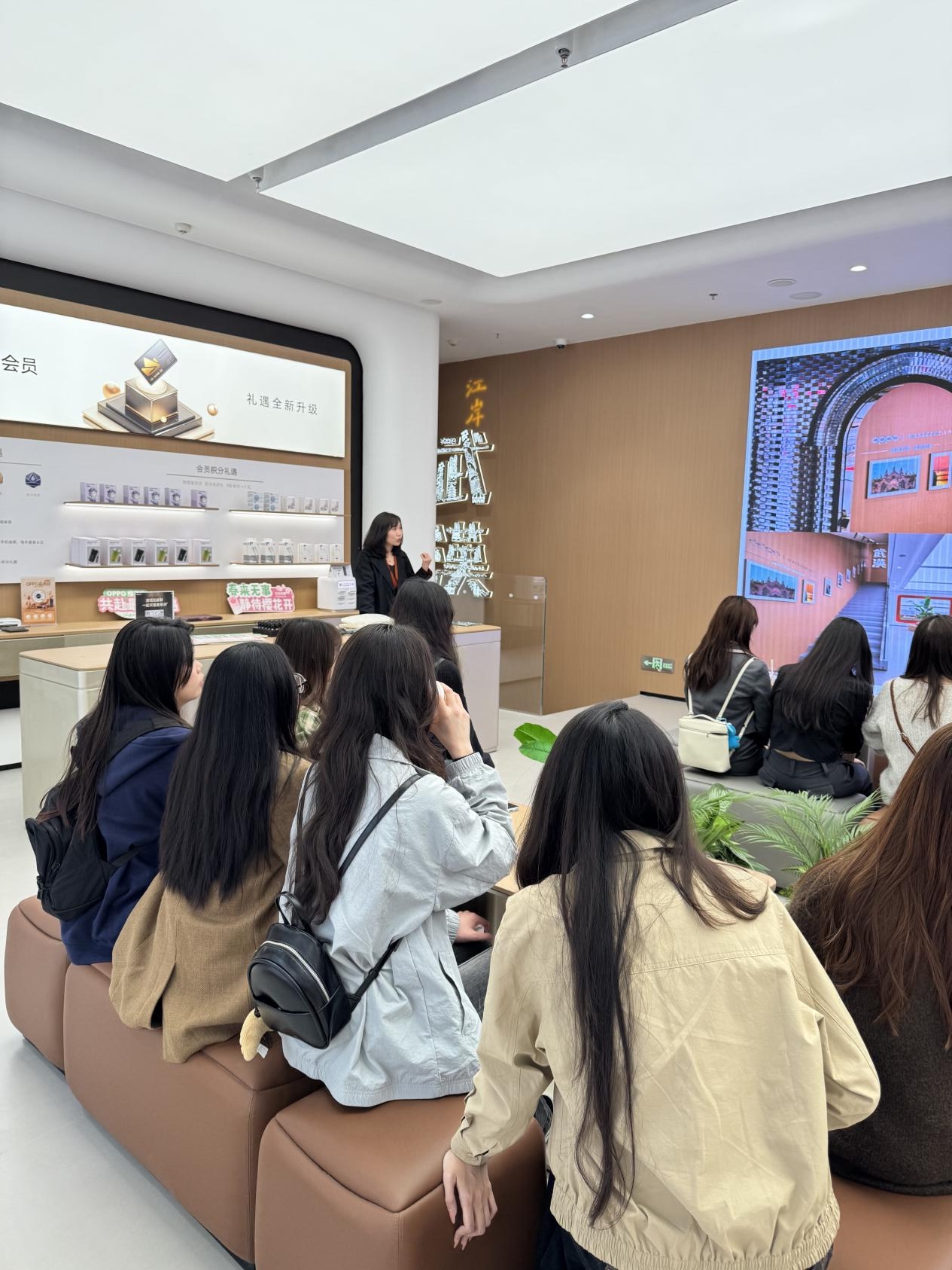 在OPPO旗舰店RM活动运营经理吴佩的引导下,师生们先后参观了门店的手机销售区、互动交流区和售后服务区,了解其“趁现在”的品牌定位与文化。店内融合了武汉本土文化的场景陈列、游戏互动装置以及透明LED屏幕等科技元素,直观展现了OPPO旗舰店如何通过“场景嫁接”和“场景叠加”提升用户的沉浸感与参与感。吴佩表示,旗舰店不仅是销售场所,更是品牌价值与文化的立体化表达。