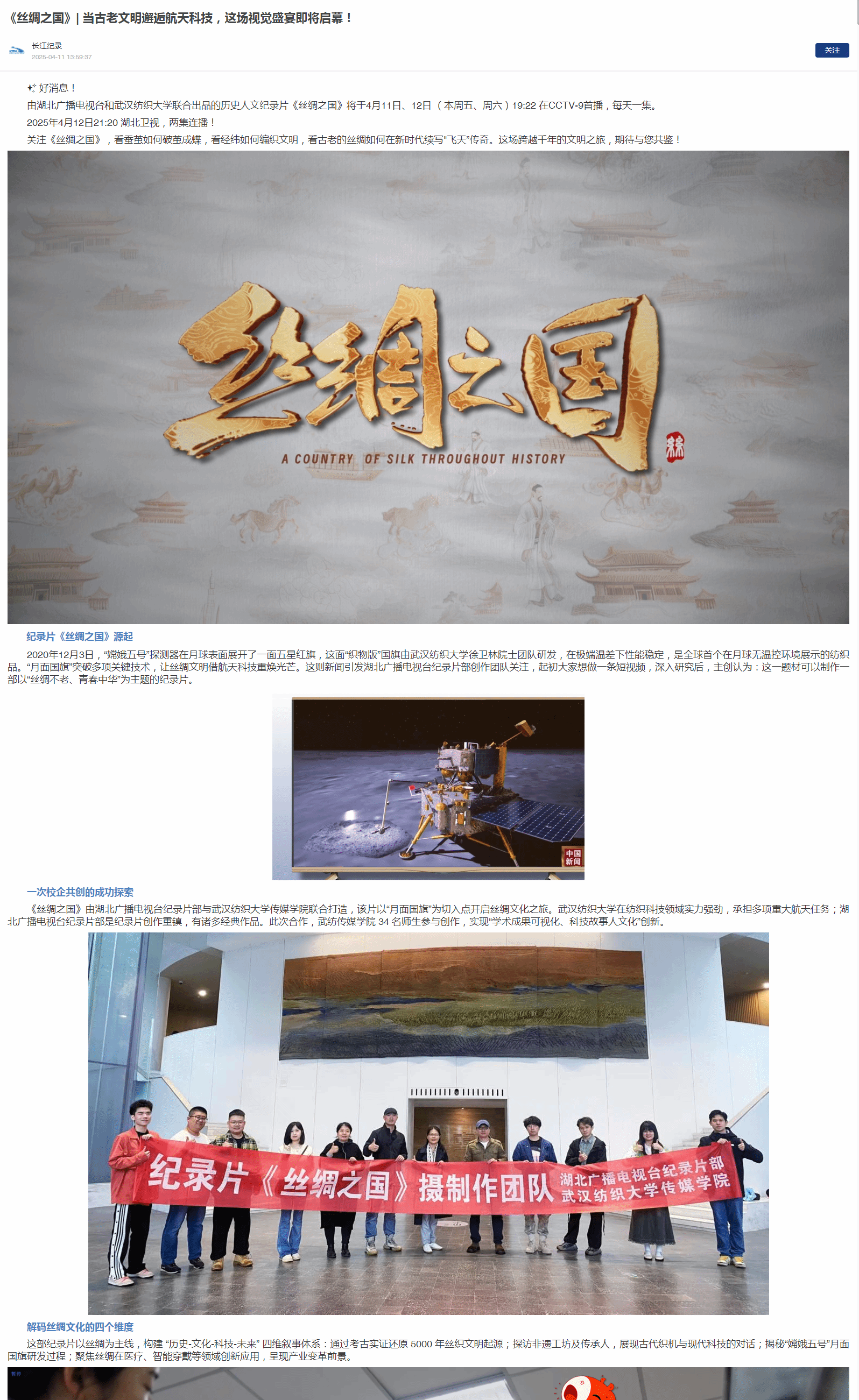 《丝绸之国》由湖北广播电视台纪录片部与伟德国际1946bv官网联合打造,该片以“月面国旗”为切入点开启丝绸文化之旅。bevictor伟德官网入口在纺织科技领域实力强劲,承担多项重大航天任务;湖北广播电视台纪录片部是纪录片创作重镇,有诸多经典作品。此次合作,武纺伟德国际1946bv官网 34 名师生参与创作,实现“学术成果可视化、科技故事人文化”创新。