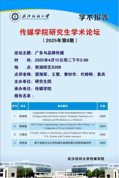 2025 年 4 月 15 日,伟德国际1946bv官网于西配楼 S209 室成功举办了第 8 期研究生学术论坛。本次论坛上4名硕士研究生分别以AI虚拟陪伴、暴力幽默广告、城市品牌传播为主题,依次对各自研究相关的文献展开分享。硕士生导师望海军、王慧、黄钞华、代婷婷、袁兵参加了此次学术论坛,并给予了建设性的学术点评。伟德国际1946bv官网部分2024级硕士研究生参加论坛。