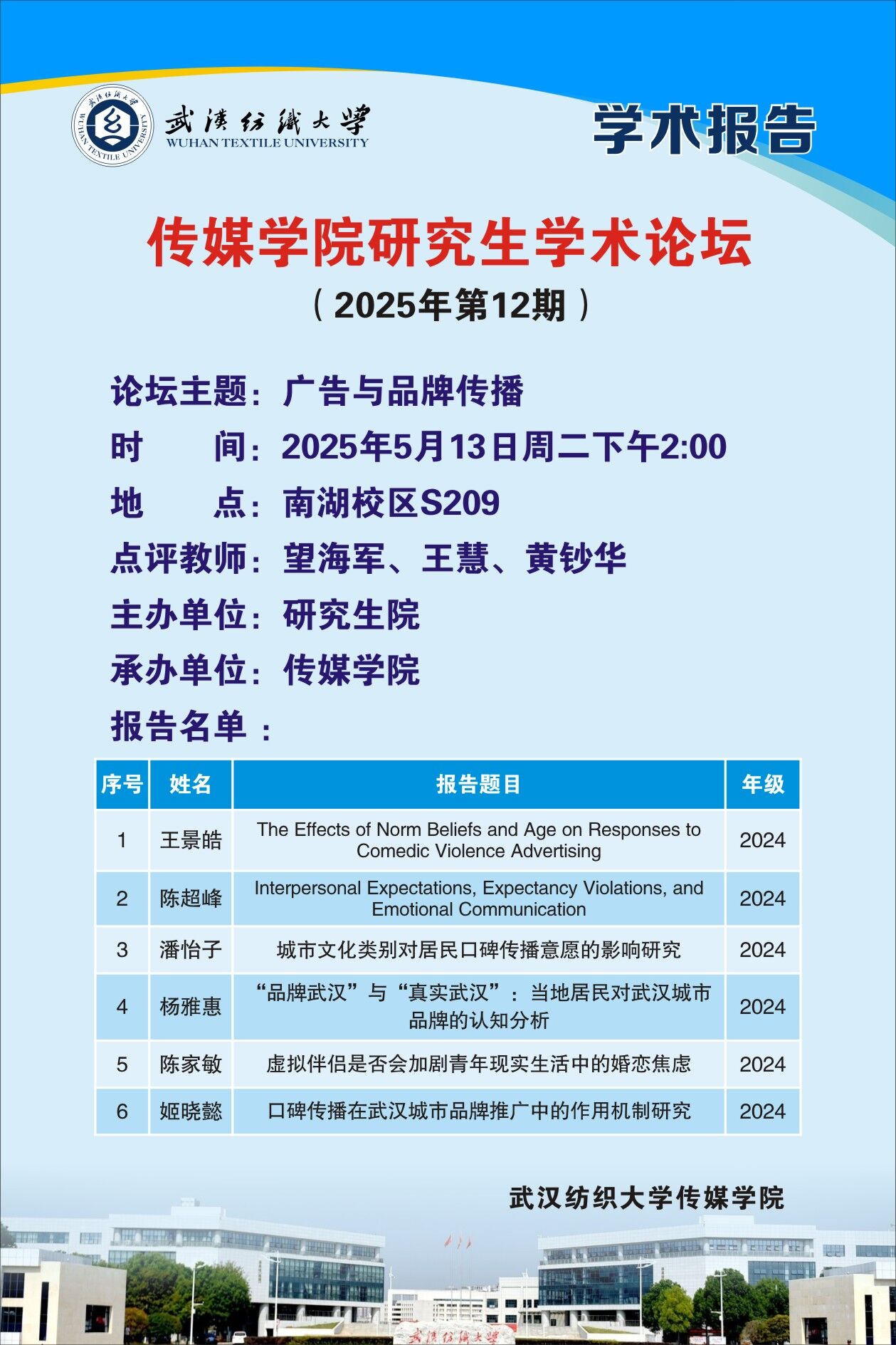 2025年5月13日,伟德国际1946bv官网于西配楼 S209 室举办了第12期研究生学术论坛。本次论坛上6名硕士研究生分别以暴力幽默广告、AI虚拟陪伴、城市品牌传播为主题,依次对各自研究相关的文献展开分享。硕士生导师望海军、王慧、黄钞华参加了此次学术论坛,并给予了建设性的学术点评。伟德国际1946bv官网部分2024级硕士研究生参加论坛。