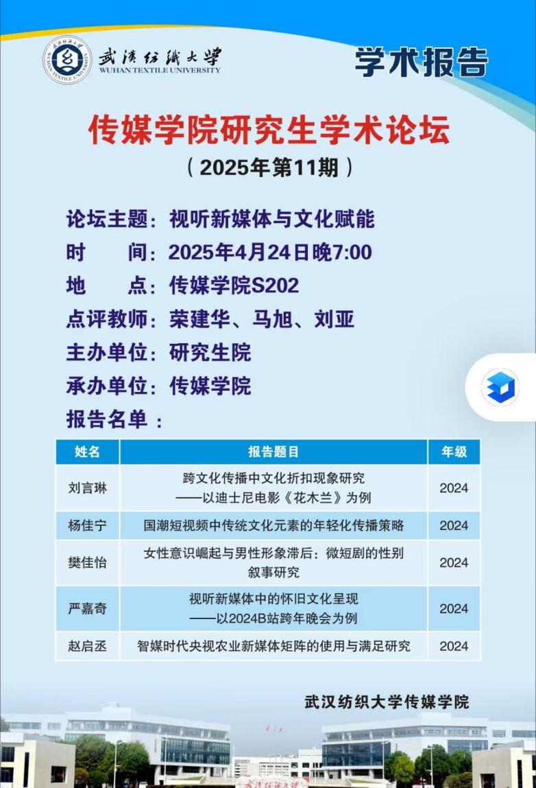 为促进学生学术思维与创新精神的发展,增进师生之间的学术交流与对话,伟德国际1946bv官网于2025年4月24日举办了本年度第11期研究生学术论坛。本次论坛以“视听新媒体与文化赋能”为主题,来自戏剧与影视、新闻与传播专业的研究生们,分享自己的研究成果,并就相关议题进行了深入的学术交流与探讨。