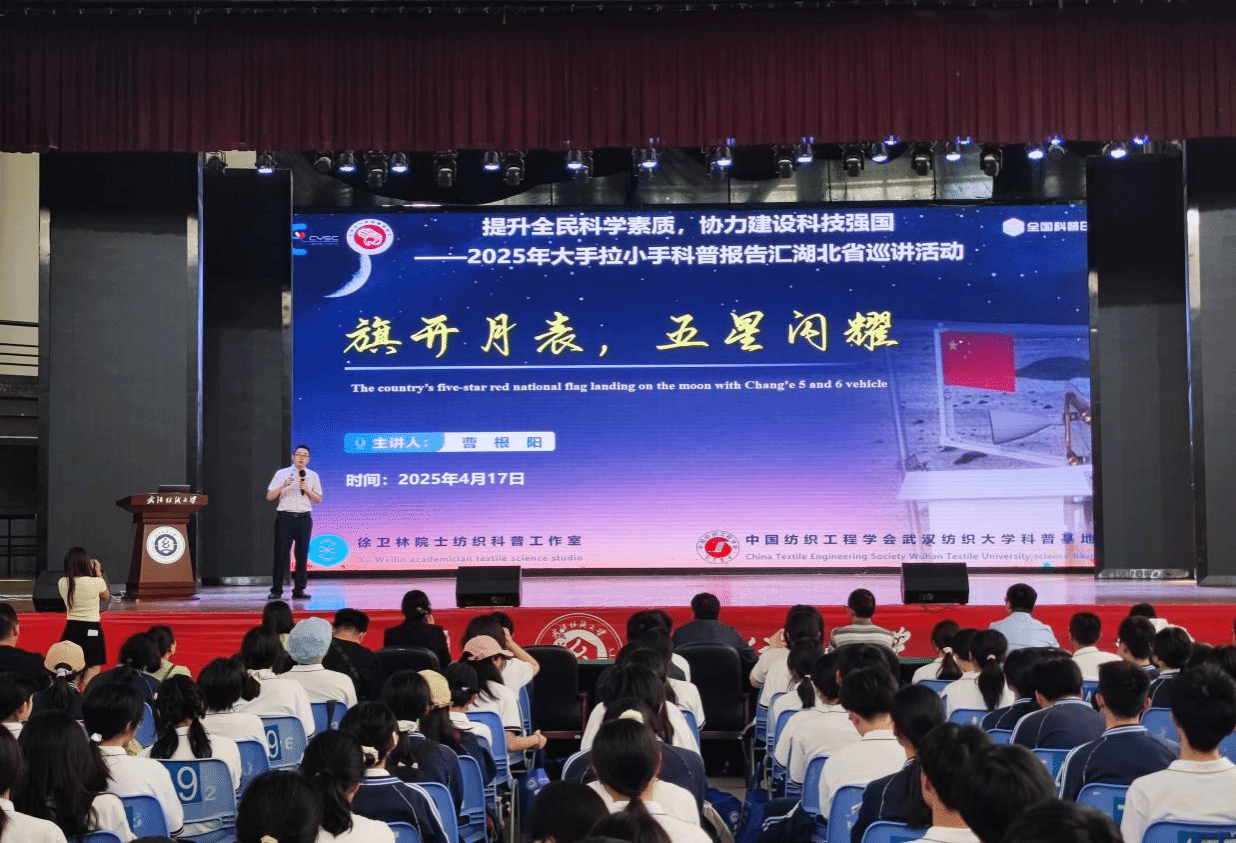 会上,全国重点实验室曹根阳教授为应城一中的师生们呈现了一场题为《旗开月表 五星闪耀》的科普讲座。曹根阳通过具体案例深入浅出地讲解了太空环境的特殊性,详细解析嫦娥六号任务中月面石头版国旗所面临的科技挑战,科普五星红旗在太空闪耀背后的科学原理。他说,五星红旗不仅是我们国家的象征,更是我们中国人的自豪与荣耀。对于青年科研人员而言,研制月面国旗不仅是技术上的挑战,更是一次生动的爱国主义教育。我们依靠自己的力量,展现了科技自信和文化自信。应城一中高一(17)班的李同学兴奋地表示:“我之前从未想过纺织科技可以如此‘硬核’,这次讲座彻底颠覆了我对纺织业的看法。”