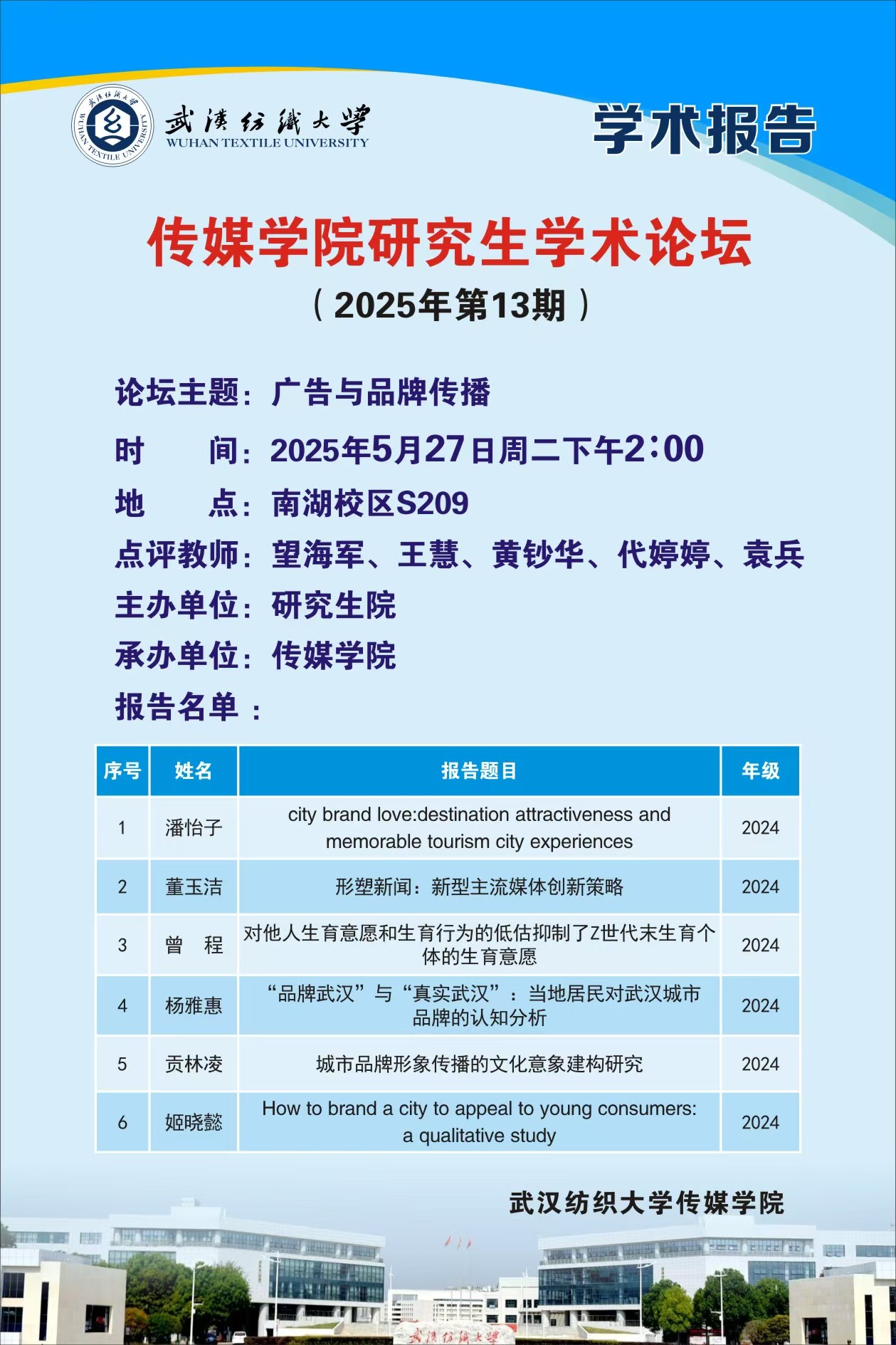 2025年5月27日,伟德国际1946bv官网于西配楼 S209 室举办了第13期研究生学术论坛。本次论坛上6名硕士研究生以城市品牌传播以及社交媒体对育龄女性生育意愿的影响为主题,分享各自的研究进展。硕士生导师望海军、王慧、黄钞华、代婷婷、袁兵参加了此次学术论坛,并给予了建设性的学术点评。伟德国际1946bv官网部分2024、2023级硕士研究生参加论坛。