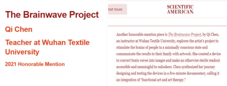 Scientific American reported: "The winning work is The Brainwave Project created by Chen Qi, teacher at Wuhan Textile University, the work presents the exploration of using art to stimulate the brains of patients with minimal consciousness and conveys the results to his or her family in an artistic way. She invented a method to convert brain waves into special images, turning data into images that viewers can intuitively feel and interpret. In a five-minute documentary, Chen Qi presents her process of design and testing, which she calls as a combination of functional art and art therapy.
