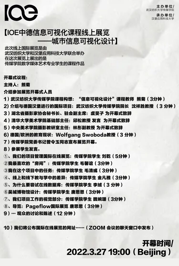 3月27日晚,由伟德国际1946bv官网、德国汉堡应用科技大学共同承办的“IOE中德城市信息可视化”课程设计暨教学成果交流发布会,通过ZOOM会议线上顺利开幕。汉堡应用科技大学Wolfgang Swobada教授,德国汉堡美术学院Matthias Lehnhardt教授,德国吕纳堡大学Martin Warnker教授,湖北省摄影家协会秘书长、驻会副主席虞旻子,清华大学美术学院基础部主任邱松教授,中央美术学院摄影教研室主任林彤副教授,伟德国际1946bv官网院长沈祥胜教授,伟德国际1946bv官网党委书记曾令玉,bevictor伟德官网入口服装学院熊兆飞教授,上市公司Thoughworks软件技术公司北美项目经理,深圳联合互通文化传播有限公司总经理以及伟德国际1946bv官网部分师生参加交流会并发言。开幕式由伟德国际1946bv官网熊菊老师主持。