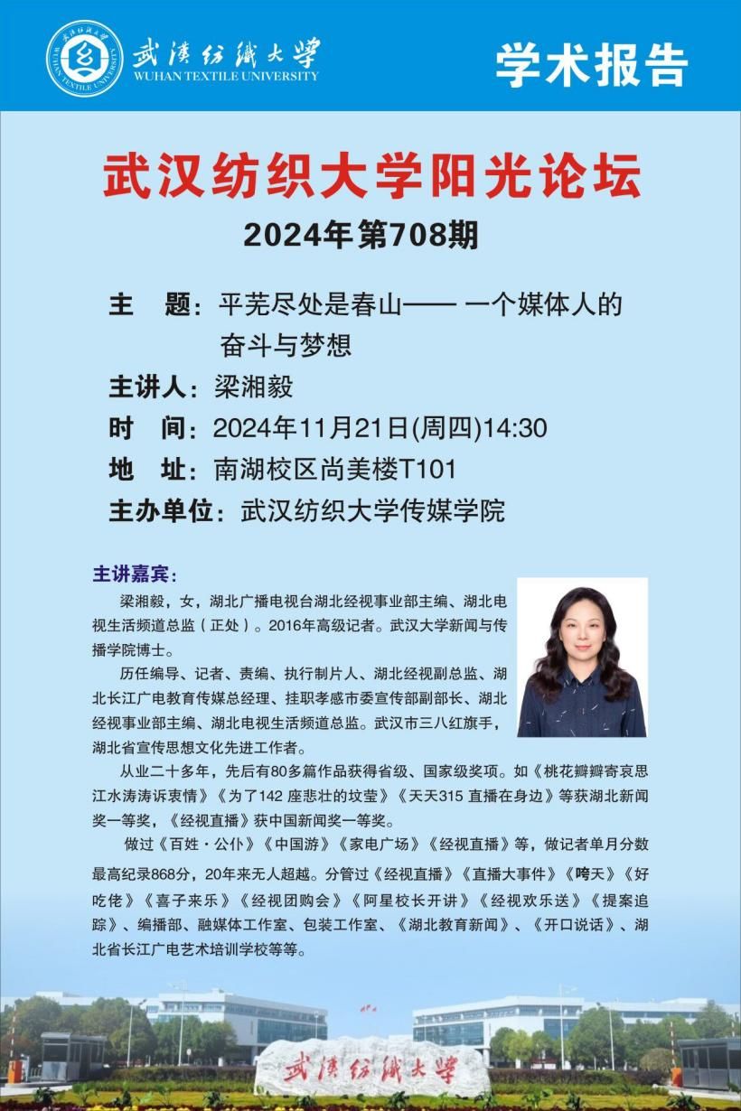 11月21日下午,bevictor伟德官网入口2024年第708期阳光论坛在南湖校区尚美楼T101成功举办。本次论坛特别邀请了湖北广播电视台湖北经视事业部主编、湖北电视生活频道总监——梁湘毅,她以“平芜尽处是春山—一个媒体人的奋斗与梦想”为主题,分享了她作为媒体人的职业生涯和对新闻行业的深刻见解。会议由伟德国际1946bv官网副院长马庆主持,伟德国际1946bv官网部分师生代表参与了本次阳光论坛。