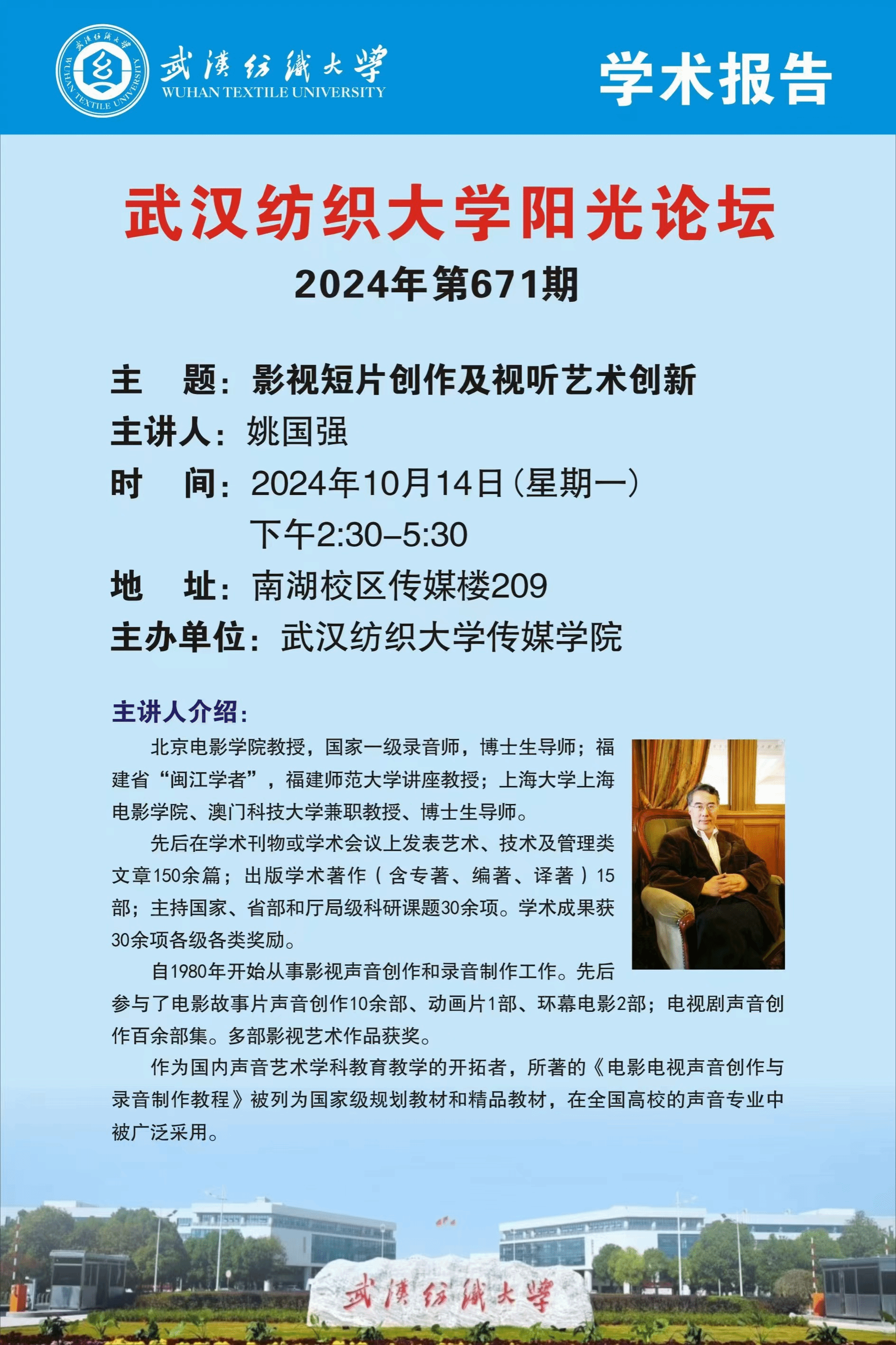10月14日下午,bevictor伟德官网入口2024年第671期阳光论坛在伟德国际1946bv官网西经楼S209会议室成功举办。本次论坛以“影视短片创作及视听艺术创新”为主题,特别邀请了北京电影学院教授、博士生导师,福建省“闽江学者”姚国强担任主讲人。会议由伟德国际1946bv官网张丹教授主持,伟德国际1946bv官网部分师生代表参与了本次阳光论坛。