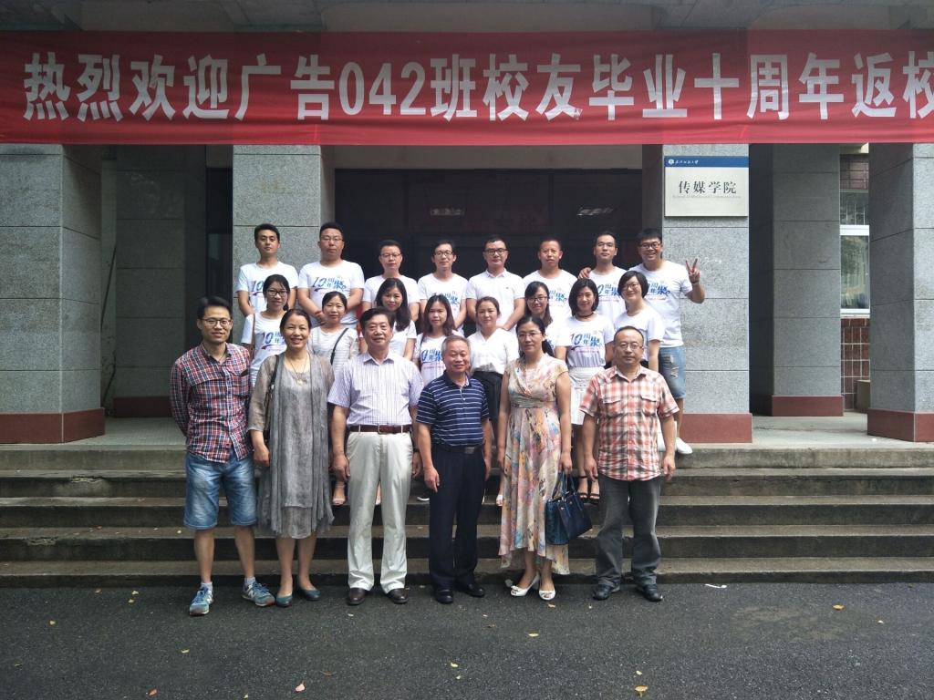 2004年10月,广告042班作为第一批进驻纺大新校区的班级,团结进取、务实拼搏,创建优良班风学风,于2006年荣获湖北省先进班集体。2008年毕业季他们离开校园迈进社会,2018年毕业季他们百忙之中重返母校,在阳光校区曾经的班级晚点名教室里开一场班会,在学生食堂吃一顿午饭,追忆青葱岁月时不禁感慨:当年种下的小树已长得郁郁葱葱,当年的黄土地如今已绿草茵茵,学校的发展日新月异,十年的时间母校的变化非常巨大!