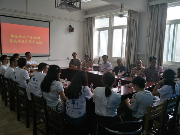 2018年6月30日,伟德国际1946bv官网广告042班校友毕业十周年重返母校,追忆大学时光,共叙师生情谊,与伟德bv1946官网领导、老师一游校园、开班会,见证母校十年发展变化!伟德国际1946bv官网党委书记曾令玉、人文通识中心张贤根教授、实验室魏玲老师、班主任冯易老师、广告系专业教师代表等参加了校友交流活动。
