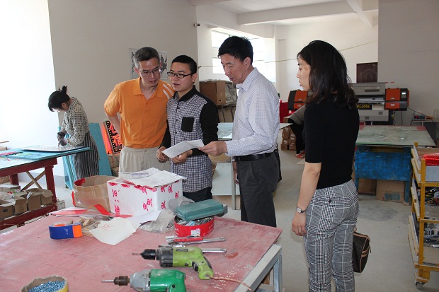 5月3日上午,学院党委书记汪圣云、副书记段溢波和辅导员龚昭、常利利老师等一行四人,赴咸宁市科技园,参观考察2014届校友李勇创办的华术led灯箱厂。